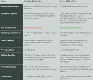 ជម្រើសនៃការវិនិយោគ៖ ប្រទេសព័រទុយហ្គាល់ផ្តោតលើមូលនិធិ និងការបរិច្ចាគជូនគម្រោងវប្បធម៌របស់ជាតិ។ ប្រទេសក្រិកផ្តល់ជម្រើសសម្បូរបែប រួមមានអចលនទ្រព្យ ប័ណ្ណមូលនិធិរដ្ឋាភិបាល ប្រាក់បញ្ញើធនាគារ និងការវិនិយោគផ្សេងៗចាប់ពី €250,000-€800,000។